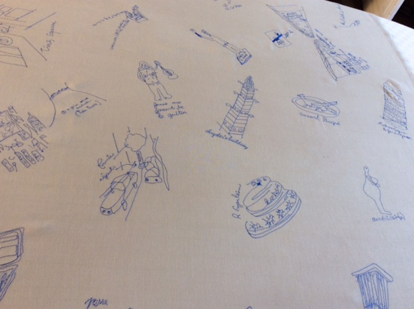 Nappe en lin brodée de dessins d'enfants "Souvenirs de voyage "